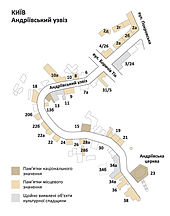 The descent, totalling 720 metres (2,360 ft) in length, is constructed of laid cobblestones. It winds down steeply around the Zamkova Hora hill, ending near the Kontraktova Square in the Podil. The Andriyivskyy Descent is marked by a couple historic landmarks, including the Castle of Richard the Lionheart, the 18th century baroque Saint Andrew's Church, famed Russian writer Mikhail Bulgakov's house, and numerous other monuments.