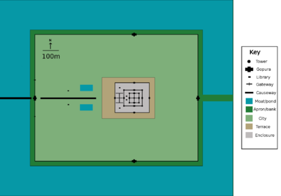 The temple stands on a terrace raised higher than the city. It is made of three rectangular galleries rising to a central tower, each level higher than the last. Mannikka interprets these galleries as being dedicated to the king, Brahma, the moon, and Vishnu. Each gallery has a gopura at each of the points, and the two inner galleries each have towers at their corners, forming a quincunx with the central tower. Because the temple faces west, the features are all set back towards the east, leaving more space to be filled in each enclosure and gallery on the west side; for the same reason the west-facing steps are shallower than those on the other sides.