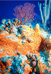 Orange elephant ear sponge, Agelas clathrodes, in foreground. Two corals in the background: a sea fan, Iciligorgia schrammi, and a sea rod, Plexaurella nutans.