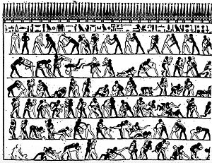 An Egyptian burial chamber mural, approximately 4000 years old, showing wrestlers in action. Even though this may appear similar to a series of animation drawings, there was no way of viewing the images in motion. It does, however, indicate the artist's intention of depicting motion.
