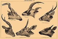 Antelope are ruminant hoofed mammals of the family Bovidae in the order of even-toed ungulates. These animals are spread relatively evenly throughout the various subfamilies of Bovidae and many are more closely related to cows or goats than to each other. There are many species of antelope, ranging in size from the tiny Royal Antelope to the ox-like Elands.