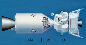 Apollo 11 spacecraft. SM: Service Module (no call sign); CM: Command Module, Columbia; LM: Lunar Module, Eagle (pre-production appearance)