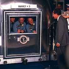 President Richard Nixon was aboard Hornet to personally welcome the astronauts back to Earth. He told the astronauts, "As a result of what you've done, the world has never been closer together before." After Nixon departed, the Hornet was brought alongside the five-ton command module where it was placed aboard by the ship's crane, placed on a dolly and moved next to the MQF. The Hornet sailed for Pearl Harbor where the command module and MQF were airlifted to the Johnson Space Centre.
