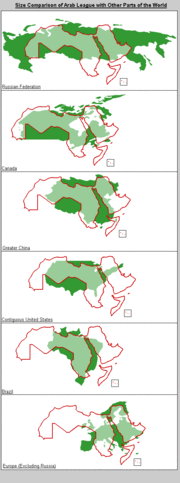The area of members of the Arab League covers around 14 million square km and straddles two continents: Asian Middle East and North Africa. The area consists of large arid desert areas (eg The Sahara) but also has several very fertile lands in the Nile Valley and the High Atlas Mountains of North Africa and the fertile crescent stretching from Iraq to Syria Lebanon and Palestine. It also has deep forests in southern Arabia and south Sudan. It has the longest river (The Nile).