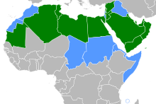 Distribution of Arabic as sole official language (green) and one of several official or national languages (blue).