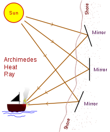 This purported weapon has been the subject of ongoing debate about its credibility since the Renaissance. René Descartes rejected it as false, while modern researchers have attempted to recreate the effect using only the means that would have been available to Archimedes. It has been suggested that a large array of highly polished bronze or copper shields acting as mirrors could have been employed to focus sunlight onto a ship. This would have used the principle of the parabolic reflector in a manner similar to a solar furnace.