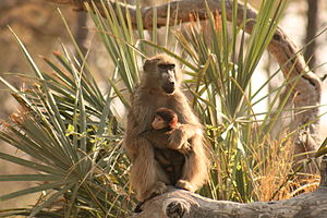In all baboon species there is pronounced sexual dimorphism, usually in size but also sometimes in colour or canine development.
