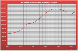 In 1900, Barcelona had a population of 533,000 people, which grew steadily but slowly until 1950, when it started absorbing a high number of people from other less-industrialized parts of Spain. Barcelona's population peaked in 1979 with 1,906,998 people, and fell throughout the 1980s and 1990s as more people sought a higher quality of life in outlying cities in the Barcelona Metropolitan Area. After bottoming out in 2000 with 1,496,266 people, the city's population began to rise again as younger people started to return, causing a great increase in housing prices.