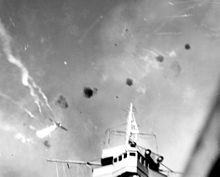 Just 30 seconds later, the next "Val" planted its bomb only 15 ft (4.6 m) away from where the first bomb hit. The resulting detonation ignited a large secondary explosion from one of the nearby 5 in (130 mm) guns' ready powder casings, killing 35 members of the nearby gun crews and starting a large fire.