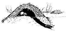 Beaver houses are formed of the same materials as the dams, with little order or regularity of structure, and seldom contain more than four adult and six or eight young beavers. Some of the larger houses have one or more partitions, but these are only posts of the main building left by the builders to support the roof, for the apartments usually have no communication with each other except by water.