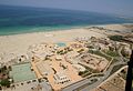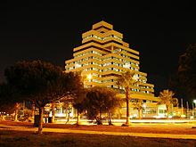 Benghazi was heavily bombed during World War II, and so the majority of buildings in the city are examples of modern or contemporary architecture. The central business district was built mostly in the 1960s and 1970s with Libya's new found oil wealth. The highest building in Benghazi is the Tibesti Hotel on Gamal Abdel Nasser Street built in 1989. Another prominent example of modern architecture in Benghazi is the Da'wah al-Islamiyah Building, which has a series of distinctive cubes piled in the shape of a pyramid.