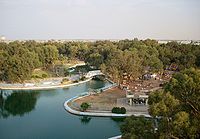 On Gamal Abdel Nasser Street is the 23rd of July Park, another large green space which faces the Tibesti Hotel and borders the waterfront. The park is popular amongst teenagers, and families on Thursday nights (as Friday is a day off work throughout Libya). Another large and popular park is al-Buduzira in North Benghazi on the al-'Uruba Road in al-Kwayfiya. The park surrounds a natural lake, and is more rugged in nature than the city parks. A section of al-Buduzira is also a water park with large slides, whilst the southern part of the park has picnic areas which are popular in the summers.