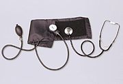 The auscultatory method uses a stethoscope and a sphygmomanometer. This comprises an inflatable ( Riva-Rocci) cuff placed around the upper arm at roughly the same vertical height as the heart, attached to a mercury or aneroid manometer. The mercury manometer, considered to be the gold standard for arterial pressure measurement, measures the height of a column of mercury, giving an absolute result without need for calibration, and consequently not subject to the errors and drift of calibration which affect other methods. The use of mercury manometers is often required in clinical trials and for the clinical measurement of hypertension in high risk patients, such as pregnant women.