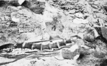 The genus Brachiosaurus, and type species B. altithorax, are based on a partial postcranial skeleton from Fruita, in the valley of the Colorado River of western Colorado. This specimen was collected from rocks of the Brushy Basin Member of the Morrison Formation in 1900 by Elmer S. Riggs and his crew from the Field Columbian Museum (now the Field Museum of Natural History) of Chicago. It is currently cataloged as FMNH P 25107. Riggs and company were working in the area as a result of favorable correspondence between Riggs and S. M. Bradbury, a dentist in nearby Grand Junction. In 1899 Riggs had sent inquiries to rural locations in the western United States concerning fossil finds, and Bradbury, an amateur collector himself, reported that dinosaur bones had been collected in the area since 1885. It was Riggs' field assistant H. W. Menke who found FMNH P 25107, on July 4, 1900. The locality, Riggs Quarry 13, was found on a small hill later known as Riggs Hill; it is marked by a plaque. Additional Brachiosaurus fossils are reported on Riggs Hill, but other fossil finds on the hill have been vandalized. Riggs published a short report in 1901, noting the unusual length of the humerus compared to the femur and the extreme overall size and the resulting giraffe-like proportions, as well as the lesser development of the tail, but did not publish a name for the new dinosaur. The titles of Riggs (1901) and (1903) suggested that the specimen was the largest known dinosaur. Riggs followed his 1903 publication that named Brachiosaurus altithorax with a more detailed description in a monograph in 1904.