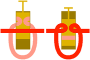 The compensating system was applied to horns to serve a different purpose. It was used to allow a double horn in F and B flat to ease playing difficulties in the high register. In contrast to the system in use in tubas and euphoniums, the default 'side' of the horn is the longer F horn, with secondary lengths of tubing coming into play when the first, second or third valves are pressed; pressing the thumb valve takes these secondary valve slides and the extra length of main tubing out of play to produce a shorter B-flat horn. A later "full double" design has completely separate valve section tubing for the two sides, and is considered superior, although rather heavier in weight.