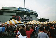 In 2002, Springsteen released his first studio effort with the full band in 18 years, The Rising, produced by Brendan O'Brien. The album, mostly a reflection on the September 11 attacks, was a critical and popular success. (Many of the songs were influenced by phone conversations Springsteen had with family members of victims of the attacks who in their obituaries had mentioned how his music touched their lives.) The title track gained airplay in several radio formats, and the record became Springsteen's best-selling album of new material in 15 years. Kicked off by an early-morning Asbury Park appearance on The Today Show, The Rising Tour commenced, barnstorming through a series of single-night arena stands in the U.S. and Europe to promote the album in 2002, then returning for large-scale, multiple-night stadium shows in 2003. While Springsteen had maintained a loyal hardcore fan base everywhere (and particularly in Europe), his general popularity had dipped over the years in some southern and midwestern regions of the U.S. But it was still strong in Europe and along the U.S. coasts, and he played an unprecedented 10 nights in Giants Stadium in New Jersey, a ticket-selling feat to which no other musical act has come close. During these shows Springsteen thanked those fans who were attending multiple shows and those who were coming from long distances or another country; the advent of robust Bruce-oriented online communities had made such practices more common. The Rising Tour came to a final conclusion with three nights in Shea Stadium, highlighted by renewed controversy over "American Skin" and a guest appearance by Bob Dylan.
