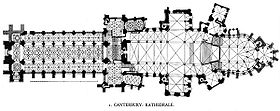 A curious bird's-eye view of Canterbury Cathedral and its annexed conventual buildings, taken about 1165, is preserved in the Great Psalter in the library of Trinity College, Cambridge. As elucidated by Professor Willis, it exhibits the plan of a great Benedictine monastery in the 12th century, and enables us to compare it with that of the 9th as seen at the abbey of Saint Gall. We see in both the same general principles of arrangement, which indeed belong to all Benedictine monasteries, enabling us to determine with precision the disposition of the various buildings, when little more than fragments of the walls exist. From some local reasons, however, the cloister and monastic buildings are placed on the north, instead, as is far more commonly the case, on the south of the church. There is also a separate chapter-house, which is wanting at St Gall.