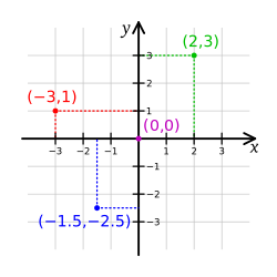 In mathematics, the Cartesian coordinate system (also called rectangular coordinate system) is used to determine each point uniquely in a plane through two numbers, usually called the x-coordinate or abscissa and the y-coordinate or ordinate of the point. To define the coordinates, two perpendicular directed lines (the x-axis, and the y-axis), are specified, as well as the unit length, which is marked off on the two axes (see Figure 1). Cartesian coordinate systems are also used in space (where three coordinates are used) and in higher dimensions.