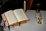 Altar in St Mary's Church in Alexandria, Virginia. The altar is at the centre of Catholic worship because it is there that the "Holy Sacrifice of the Mass" takes place.