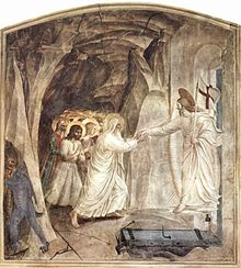Before his resurrection from the dead, Jesus Christ grants salvation to souls by the Harrowing of Hell. Oil on canvas, by Fra Angelico circa 1430s