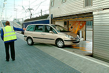 A Peugeot 807 entering a shuttle wagon at the French terminal at Coquelles near Calais in northern France