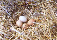 Hens will often try to lay in nests that already contain eggs and have been known to move eggs from neighboring nests into their own. Some farmers use fake eggs made from plastic or stone (or golf balls) to encourage hens to lay in a particular location. The result of this behaviour is that a flock will use only a few preferred locations, rather than having a different nest for every bird. Hens will often express a preference to lay in the same location. It is not unknown for two (or more) hens to try to share the same nest at the same time. If the nest is small, or one of the hens is particularly determined, this may result in chickens trying to lay on top of each other.