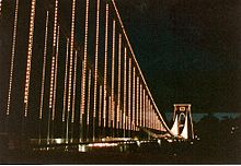 On 8 December 1864, the bridge was lit by magnesium flares for its ceremonial opening parade, but they were blown out by the wind. The custom of lighting the bridge has continued with more recent events, although later thousands of electric light bulbs were attached to the bridge instead of flares.