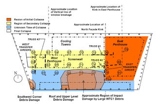 After the planes hit the buildings, but before the buildings collapsed, the cores of both towers consisted of three distinct sections. Above and below the impact floors, the cores consisted of what were essentially two rigid boxes; the steel in these sections was undamaged and had undergone no significant heating. The section between them, however, had sustained significant damage and, though they were not hot enough to melt it, the fires were weakening the structural steel. As a result, the core columns were slowly being crushed, sustaining plastic and creep deformation from the weight of higher floors. As the top section tried to move downward, however, the hat truss redistributed the load to the perimeter columns. Meanwhile, the perimeter columns and floors were also being weakened by the heat of the fires, and as the floors began to sag they pulled the exterior walls inwards. In the case of 2 WTC, this caused the eastern face to buckle, transferring its loads back to the failing core through the hat truss and initiating the collapse. In the case of 1 WTC, the south wall later buckled in the same way, and with similar consequences.