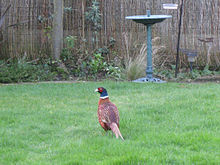 The Common Pheasant (Phasianus colchicus), is a bird in the pheasant family ( Phasianidae). It is native to Asia and has been widely introduced elsewhere as a game bird. In parts of its range, namely in places where none of its relatives occur such as in Europe (where it is naturalized), it is simply known as the "pheasant". Ring-necked Pheasant is both the name used for the species as a whole in North America and also the collective name for a number of subspecies and their intergrades which have white neck rings.
