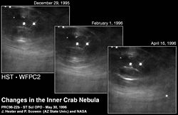 This sequence of Hubble Space Telescope images shows features in the inner Crab Nebula changing over a period of four months. Credit: NASA/ESA.