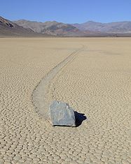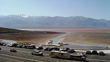 At 282 feet (86 m) below  sea level, Badwater Basin on Death Valley's floor is the second-lowest point in the Western Hemisphere (behind  Laguna del Carbón in Argentina), while  Mount Whitney, only 85 miles (137 km) to the west, rises to 14,505 feet (4,421 m). This topographic relief is the greatest elevation gradient in the  contiguous United States and is the terminus point of the  Great Basin's southwestern drainage. Although the extreme lack of water in the Great Basin makes this distinction of little current practical use, it does mean that in wetter times the lake that once filled Death Valley ( Lake Manly) was the last stop for water flowing in the region, meaning the water there was saturated in dissolved materials. Thus the  salt pans in Death Valley are among the largest in the world and are rich in minerals, such as  borax and various salts and  hydrates. The largest salt pan in the park extends 40 miles (64 km) from the Ashford Mill Site to the Salt Creek Hills, covering some 200 square miles (520 km2) of the valley floor. The best known  playa in the park is the  Racetrack, known for its moving rocks.