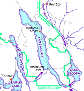 Death Valley National Park is a national park in the U.S. states of California and Nevada located east of the Sierra Nevada, occupying an interface zone between the arid Great Basin and Mojave deserts in the United States. The park protects the northwest corner of the Mojave Desert and contains a diverse desert environment of salt-flats, sand dunes, badlands, valleys, canyons, and mountains. It is the largest national park in the lower 48 states and has been declared an International Biosphere Reserve. Approximately 95% of the park is a designated wilderness area. It is the hottest and driest of the national parks in the United States. The second-lowest point in the Western Hemisphere is in Badwater Basin, which is 282 feet (86 m) below sea level. The park is home to many species of plants and animals that have adapted to this harsh desert environment. Some examples include creosote bush, Bighorn Sheep, Coyote, and the Death Valley Pupfish, a survivor of much wetter times.