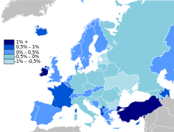 A century ago, Europe was home to 25% of the world's population. While the population of the continent has grown, it hasn't come close to the pace of Asia or Africa. As it stands now, around 12% of the world's people live on this continent, but if demographic trends keep their pace, Europe's share may fall to around 7% in 2050. Declining birth rates (particularly in Germany) and a high life expectancy in most European states means that the aging and declining population will be a problem for many European economies, political and social institutions. Countries on the edges of Europe except for Southern Europe have generally stronger growth than Central European counterparts. Albania (Although in Southern Europe) and Ireland have strong growth, all hitting 1%.