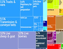 Graphical depiction of Djibouti's product exports in 28 colour-coded categories.