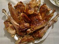 Turkeys are traditionally eaten as the main course of Christmas feasts in much of the world ( stuffed turkey) since appearing in England in the 16th century, as well as for Thanksgiving in the United States and Canada, though this tradition has its origins in modern times, rather than colonial as is often supposed. Before the 20th century, pork ribs were the most common food on the holiday, as the animals were usually slaughtered in November. Turkeys were once so abundant in the wild that they were eaten throughout the year, the food considered commonplace, whereas pork ribs were rarely available outside of the Thanksgiving-New Year season. While the tradition of turkey at Christmas spread throughout England in the 17th century, among the working classes it became common to serve goose, which remained the predominant roast until the Victorian era. While eating turkey was once mainly restricted to special occasions such as these, turkey is now eaten year-round and forms a regular part of many diets.