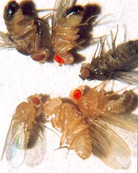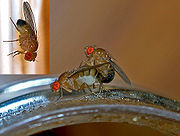 Male flies sing to the females during courtship using their wing to generate sound, and some of the genetics of sexual behaviour have been characterized. In particular, the fruitless gene has several different splice forms, and male flies expressing female splice forms have female-like behaviour and vice-versa.