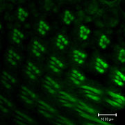 Each photoreceptor cell consists of two main sections, the cell body and the rhabdomere. The cell body contains the nucleus while the 100-μm-long rhabdomere is made up of toothbrush-like stacks of membrane called microvilli. Each microvillus is 1–2 μm in length and ~60 nm in diameter. The membrane of the rhabdomere is packed with about 100 million rhodopsin molecules, the visual protein that absorbs light. The rest of the visual proteins are also tightly packed into the microvillar space, leaving little room for cytoplasm.