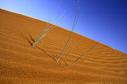 Dubai lies directly within the Arabian Desert. However, the topography of Dubai is significantly different from that of the southern portion of the UAE in that much of Dubai's landscape is highlighted by sandy desert patterns, while gravel deserts dominate much of the southern region of the country. The sand consists mostly of crushed shell and coral and is fine, clean and white. East of the city, the salt-crusted coastal plains, known as sabkha, give way to a north-south running line of dunes. Farther east, the dunes grow larger and are tinged red with iron oxide.
