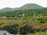 Easter Island is a volcanic high island, consisting mainly of three extinct coalesced volcanoes: Terevaka (altitude 507 metres) forms the bulk of the island, while two other volcanoes, Poike and Rano Kau, form the eastern and southern headlands and give the island its roughly triangular shape. Lesser cones and other volcanic features include the crater Rano Raraku, the cinder cone Puna Pau and many volcanic caves including lava tubes. Poike used to be a separate island until volcanic material from Terevaka united it to the larger whole. The island is dominated by hawaiite and basalt flows which are rich in iron and show affinity with igneous rocks found in the Galápagos Islands.
