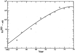 The first microscopic sample of 253Es sample weighing about 10 nanograms was prepared in 1961 at HFIR. A special magnetic balance was designed to estimate its weight. Larger batches were produced later starting from several kilograms of plutonium with the einsteinium yields (mostly 253Es) of 0.48 milligrams in 1967–1970, 3.2 milligrams in 1971–1973, followed by steady production of about 3 milligrams per year between 1974 and 1978. These quantities however refer to the integral amount in the target right after irradiation. Subsequent separation procedures reduced the amount of isotopically pure einsteinium roughly tenfold.