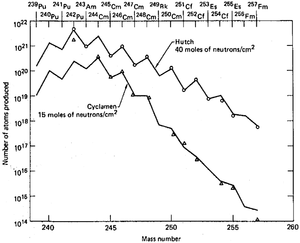 The analysis of the debris at the 10- megaton Ivy Mike nuclear test was a part of long-term project. One of the goals of which was studying the efficiency of production of transuranium elements in high-power nuclear explosions. The motivation for these experiments was that synthesis of such elements from uranium requires multiple neutron capture. The probability of such events increases with the neutron flux, and nuclear explosions are the most powerful man-made neutron sources, providing densities of the order 1023 neutrons/cm² within a microsecond, or about 1029 neutrons/(cm²·s). In comparison, the flux of the HFIR reactor is 5×1015 neutrons/(cm²·s). A dedicated laboratory was set up right at Enewetak Atoll for preliminary analysis of debris, as some isotopes could have decayed by the time the debris samples reached the mainland U.S. The laboratory was receiving samples for analysis as soon as possible, from airplanes equipped with paper filters which flew over the atoll after the tests. Whereas it was hoped to discover new chemical elements heavier than fermium, none of these were found even after a series of megaton explosions conducted between 1954 and 1956 at the atoll.