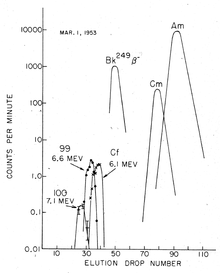 Separation of trivalent actinides from lanthanide fission products can be done by a cation-exchange resin column using a 90% water/10% ethanol solution saturated with hydrochloric acid (HCl) as eluant. It is usually followed by anion-exchange chromatography using 6 molar HCl as eluant. A cation-exchange resin column (Dowex-50 exchange column) treated with ammonium salts is then used to separate fractions containing elements 99, 100 and 101. These elements can be then identified simply based on their elution position/time, using α-hydroxyisobutyrate solution (α-HIB), for example, as eluant.