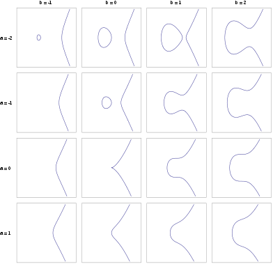 A catalog of elliptic curves. Region shown is [−3,3]2 (For a = 0 and b = 0 the function is not smooth and therefore not an elliptic curve.)