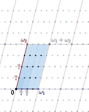 An elliptic curve over the complex numbers is obtained as a quotient of the complex plane by a lattice Λ, here spanned by two fundamental periods ω1 and ω2. The four-torsion is also shown, corresponding to the lattice 1/4 Λ containing Λ.