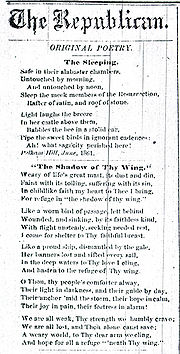 A few of Dickinson's poems appeared in Samuel Bowles' Springfield Republican between 1858 and 1868. They were published anonymously and heavily edited, with conventionalized punctuation and formal titles. The first poem, "Nobody knows this little rose", may have been published without Dickinson's permission. The Republican also published "A narrow Fellow in the Grass" as "The Snake"; "Safe in their Alabaster Chambers –" as "The Sleeping"; and "Blazing in the Gold and quenching in Purple" as "Sunset". The poem "I taste a liquor never brewed –" is an example of the edited versions, the last two lines in the first stanza were completely rewritten for the sake of conventional rhyme.