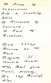 The letter was unsigned, but she had included her name on a card and enclosed it in an envelope along with four of her poems. He praised her work but suggested that she delay publishing until she had written longer, being unaware that she had already appeared in print. She assured him that publishing was as foreign to her "as Firmament to Fin" but also proposed that "If fame belonged to me, I could not escape her".