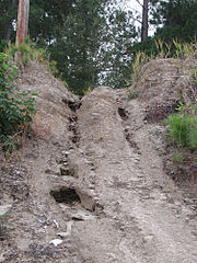 Gully erosion results where water flows along a linear depression eroding a trench or gully. This is particularly noticeable in the formation of hollow ways, where, prior to being tarmacked, an old rural road has over many years become significantly lower than the surrounding fields.