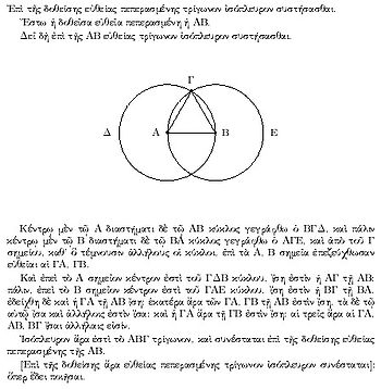 A proof from Euclid's elements that, given a line segment, an equilateral triangle exists that includes the segment as one of its sides. The proof is by construction: an equilateral triangle ΑΒΓ is made by drawing circles Δ and Ε centered on the points Α and Β, and taking one intersection of the circles as the third vertex of the triangle.