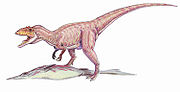 Eustreptospondylus ("well-curved vertebra", in reference to the arrangement of the spine in the original fossil) was a genus of megalosaurid dinosaurs from the Callovian stage of the Middle Jurassic period (164.7-161.2 million years ago) in southern England, at a time when Europe was a series of scattered islands (due to tectonic movement at the time which raised the sea-bed and flooded the lowland). Eustreptospondylus is thought to have been between 5-7 meters long (17-23 feet) and around 2 meters tall (6 ft 6 in). It was carnivorous, bipedal and had a stiffened tail. It was a typical theropod, with powerful hind limbs, erect posture and small forelimbs.