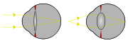 When a creature with binocular vision looks at an object, the eyes must rotate around a vertical axis so that the projection of the image is in the centre of the retina in both eyes. To look at an object closer by, the eyes rotate 'towards each other' ( convergence), while for an object farther away they rotate 'away from each other' ( divergence). Exaggerated convergence is called cross eyed viewing (focusing on the nose for example) . When looking into the distance, or when 'staring into nothingness', the eyes neither converge nor diverge.